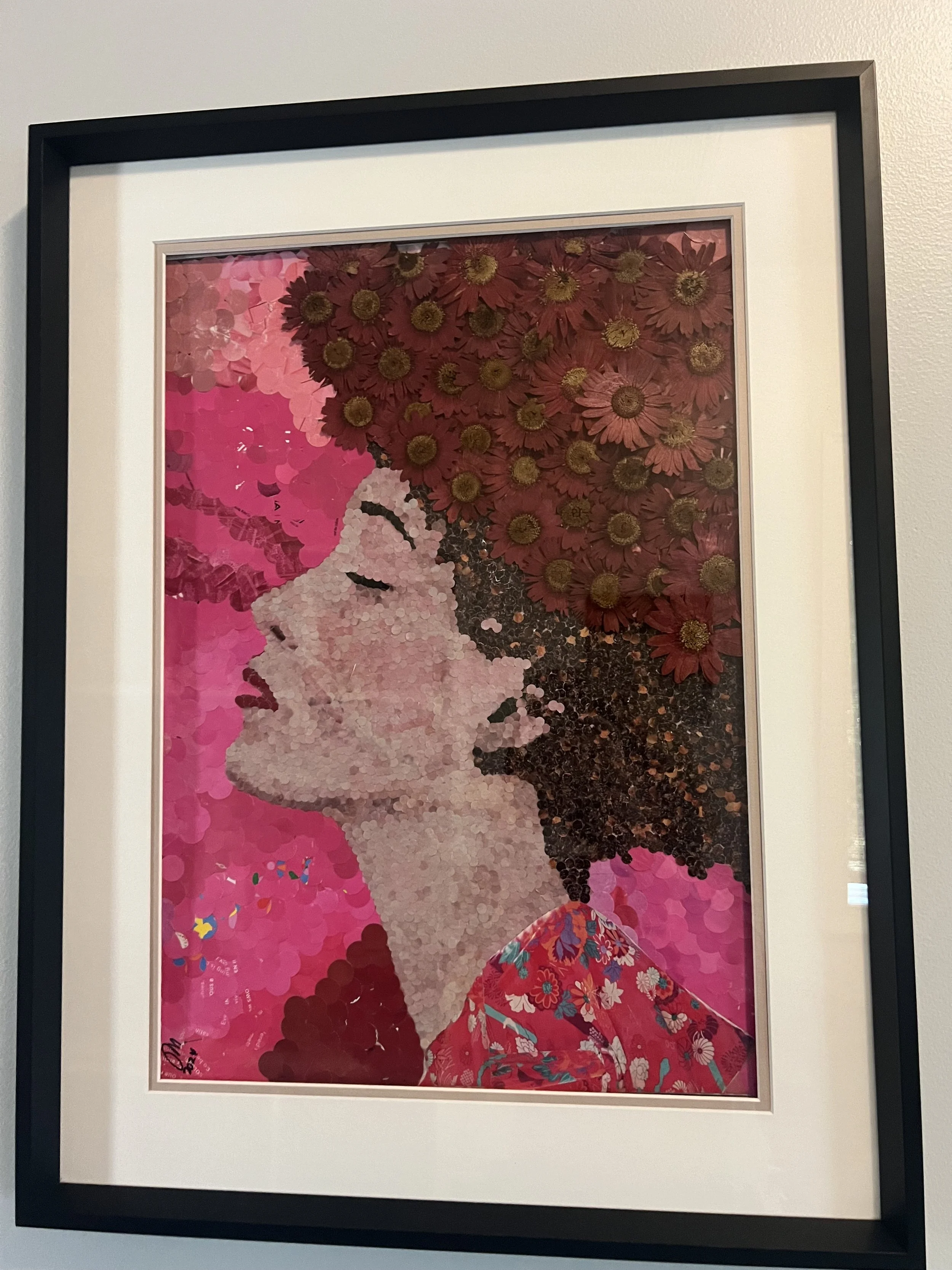 Made with paper hole punch and real flowers, this portrait represents the confident woman who exudes a magnetic allure, effortlessly blending beauty with an aura of tranquility. Her poise is a testament to her self-assuredness, reflected in every graceful movement and composed gesture. With a serene demeanor, she navigates through life's challenges with unwavering grace, embodying a sense of inner peace that captivates those around her. Her confidence emanates from within, radiating a quiet strength that speaks volumes without the need for words. She carries herself with elegance, embracing her unique beauty with a quiet confidence that leaves a lasting impression on everyone she encounters.